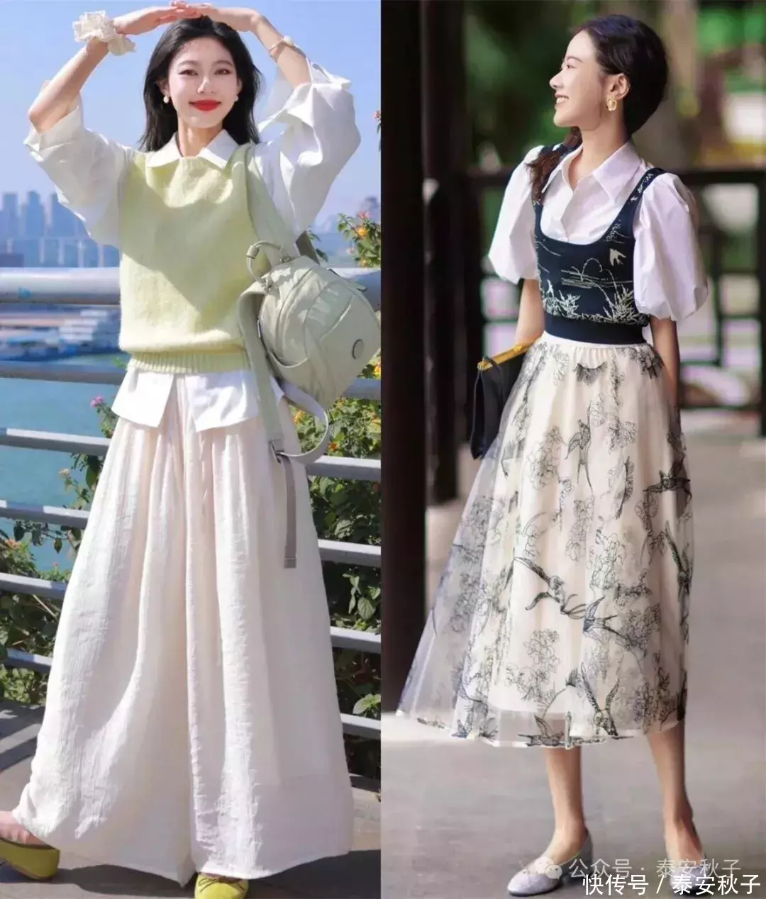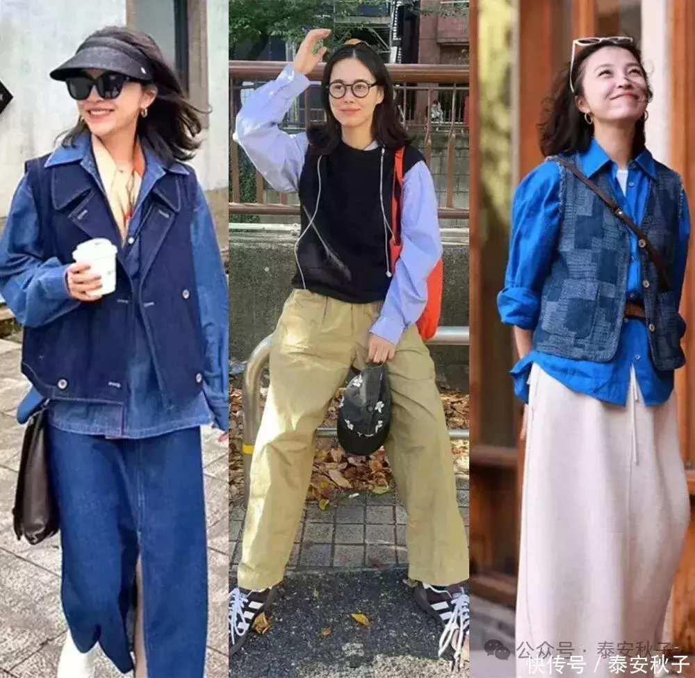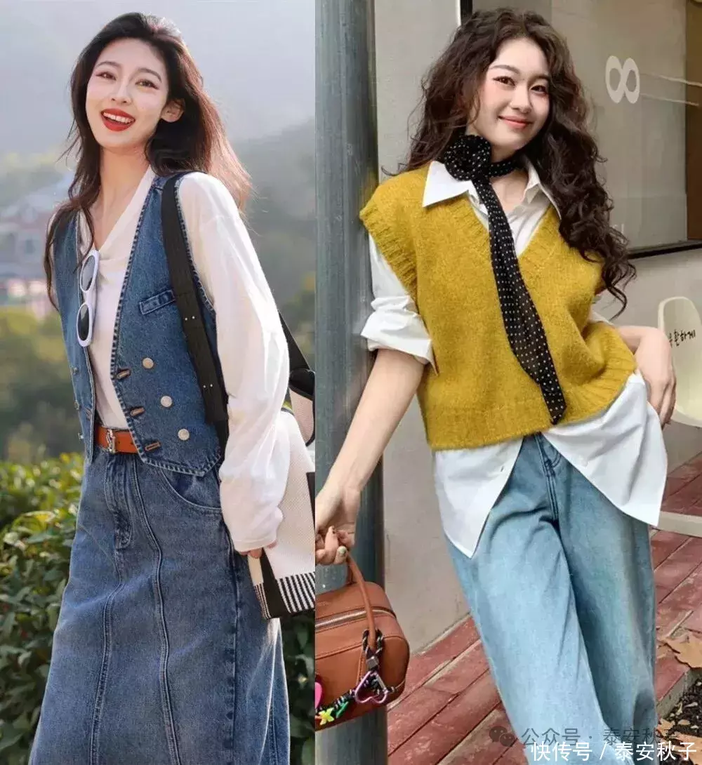 马上就要国庆节了,喜欢出门逛吃逛吃的女生,可以将不同颜色与材质的马甲+衬衫+裙/裤进行叠穿,凹出N种时尚造型来。