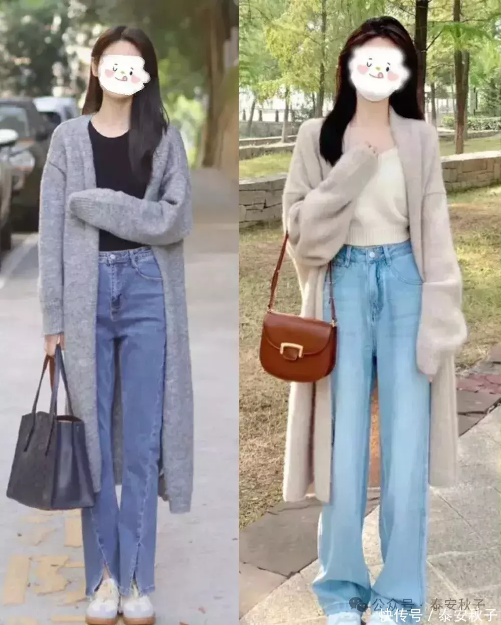 浅咖色的大开衫,宽松茧形的设计会有一种轻松自由的风格感。到小黑衫+蓝牛仔裤,慵懒随性很适合仲秋。